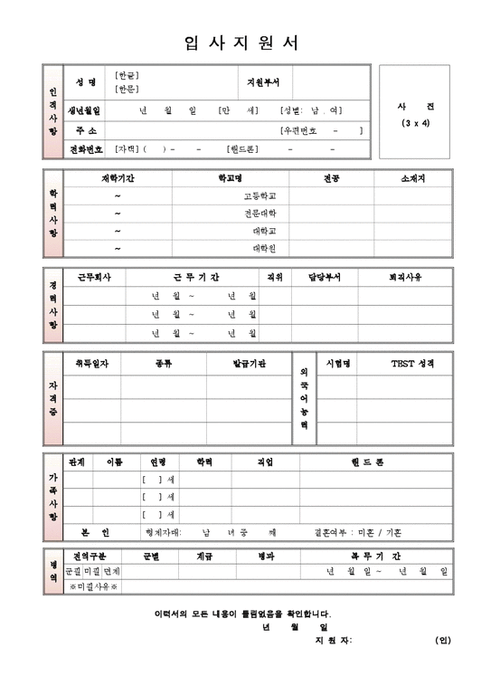 [2] 잡코리아 - 국문 이력서 - 신입, 경력 한글 입사 지원서 양식 다운로드 (https://www.jobkorea.co.kr/goodjob/docs/form?schOrder=1&schFile=0&schTxt=&schCol=000001)