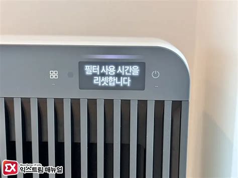 패널을 닫고, 작동 패널에서 “필터 리셋” 버튼을 3초 이상 눌러 교체 완료를 알립니다.