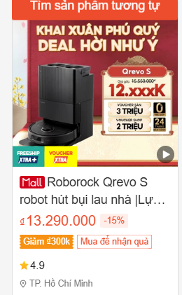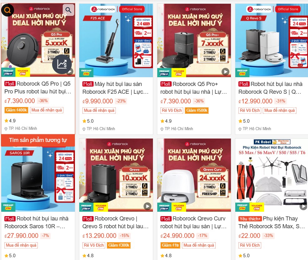 가장 강추하는 아이템은 로보락 청소기입니다. 최근에 나온 로보락 Qrevo Curv는 가격이 비슷하지만 Q REVO S는 약 119만 원, 베트남에서는 약 77만 원 정도로 구매할 수 있습니다. 로보락 S8 MaxV Ultra는 네이버에서 약 150만 원 정도지만, 쇼피에서는 23,000,000동으로 한국 돈으로 약 130만 원에 구매할 수 있어 한국보다 20만 원 정도 저렴합니다.