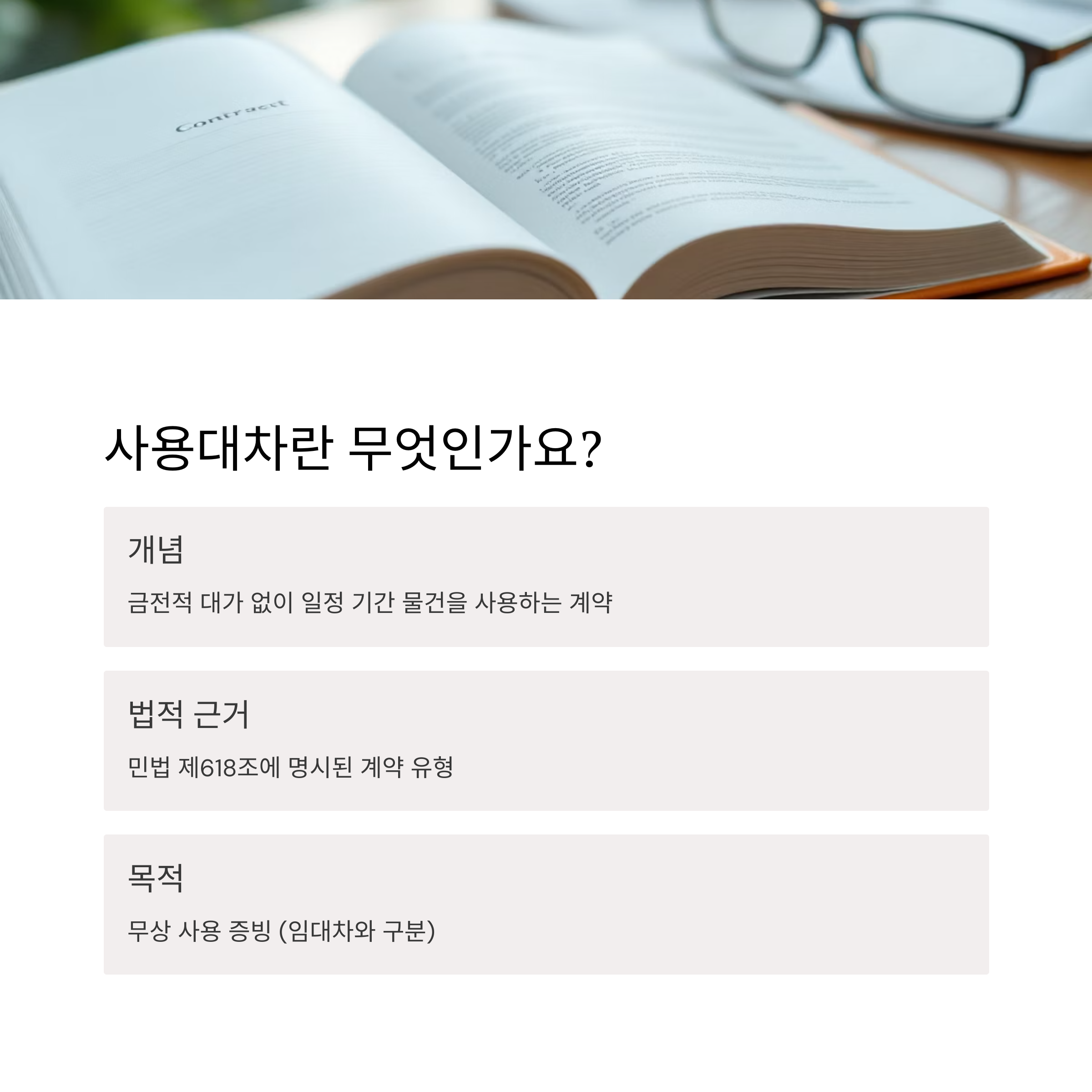 사용대차란 금전적인 대가 없이 일정 기간 물건을 사용하는 계약입니다.