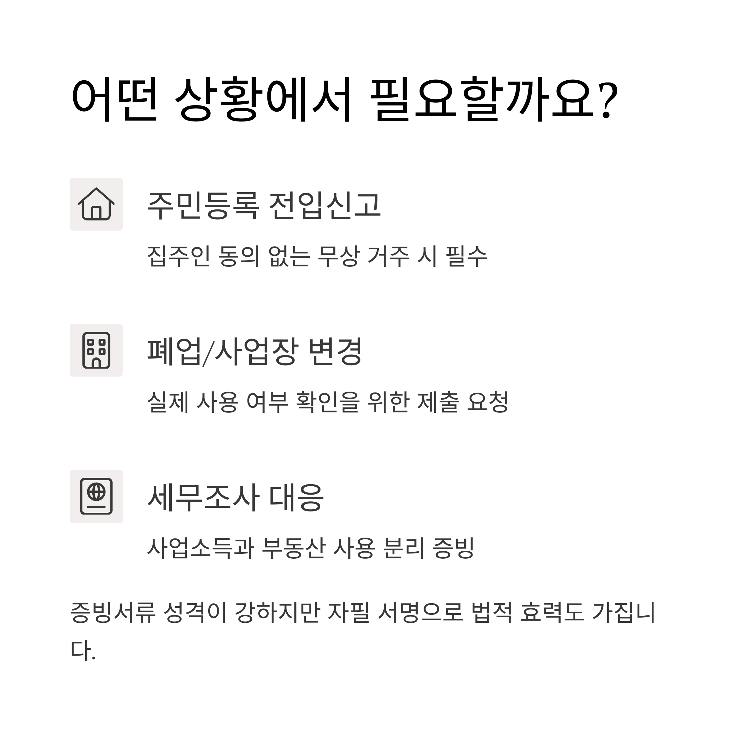 | 사용 목적 | 전입, 거주, 사업장 등록 등 |