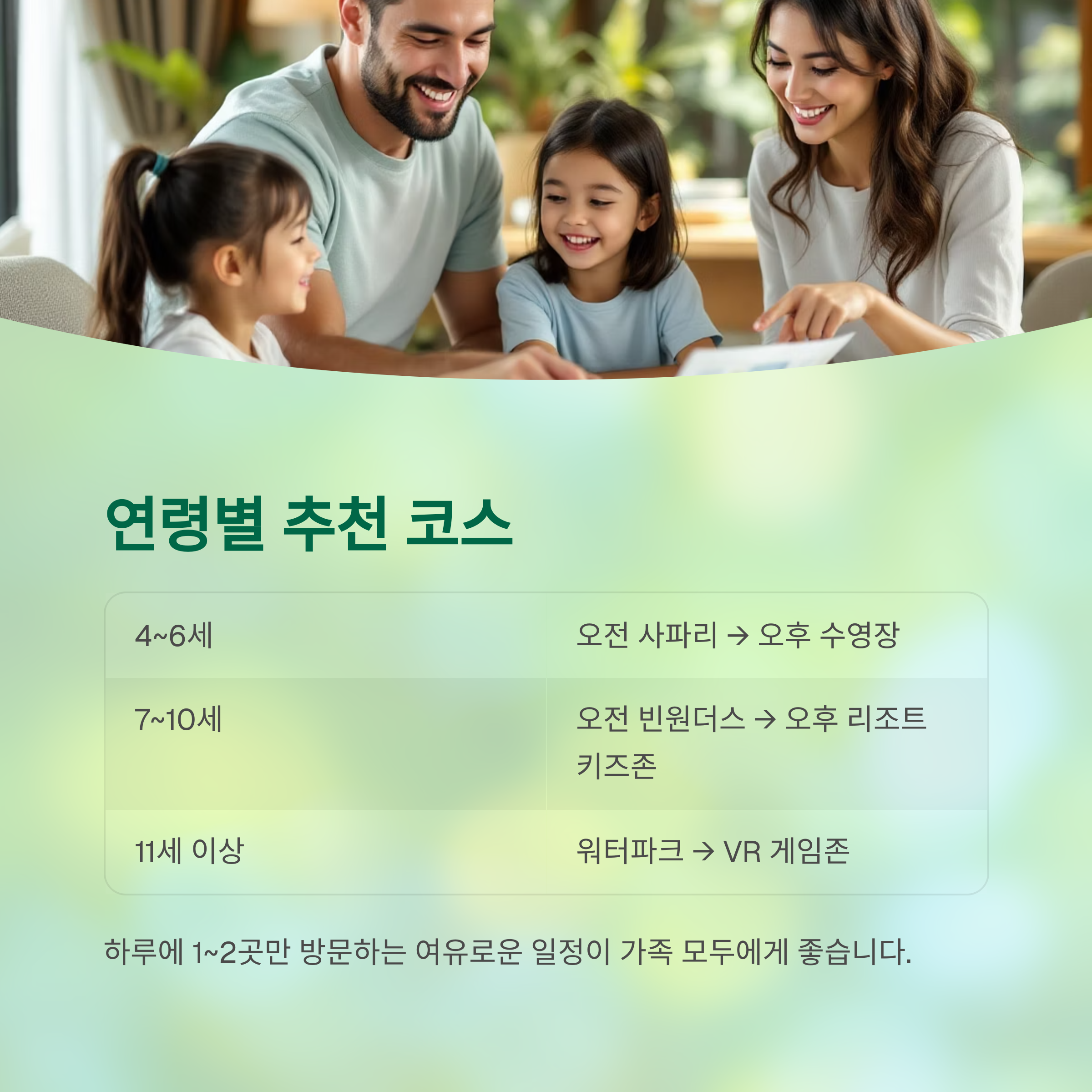 | 4~6세 | 오전 사파리 → 오후 수영장 | 동물 체험 + 휴식 병행 |