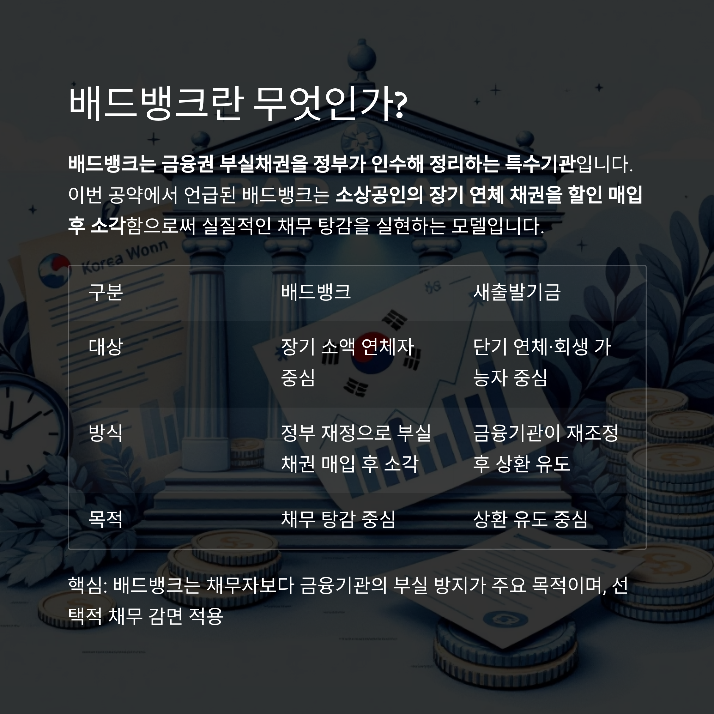 이번 공약에서 언급된 배드뱅크는 소상공인의 장기 연체 채권을 할인 매입 후 소각함으로써 실질적인 채무 탕감을 실현하는 모델입니다