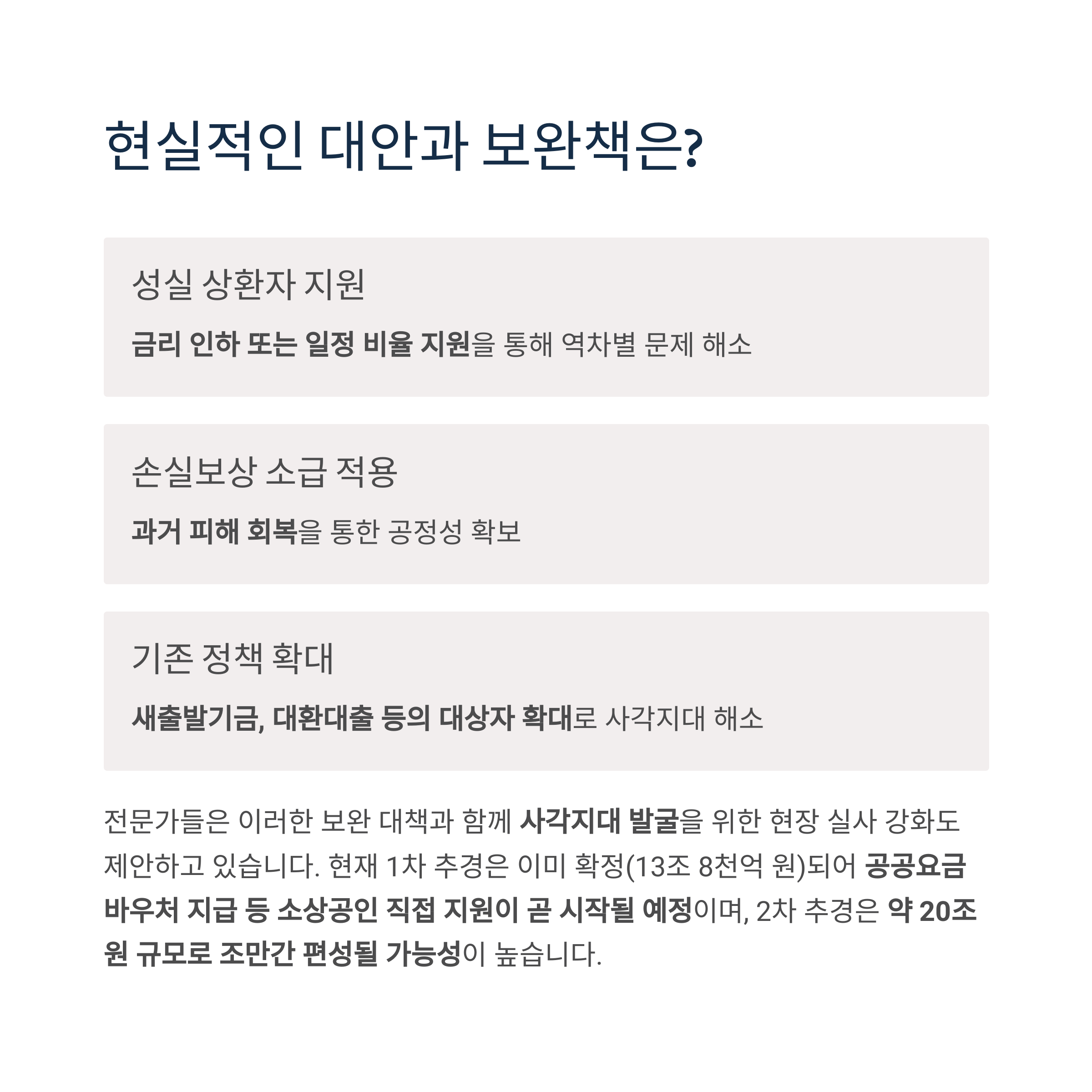 | 보완 정책 | 저금리 대환 대출, 장기 분할 상환 프로그램, 새출발기금 확대 |