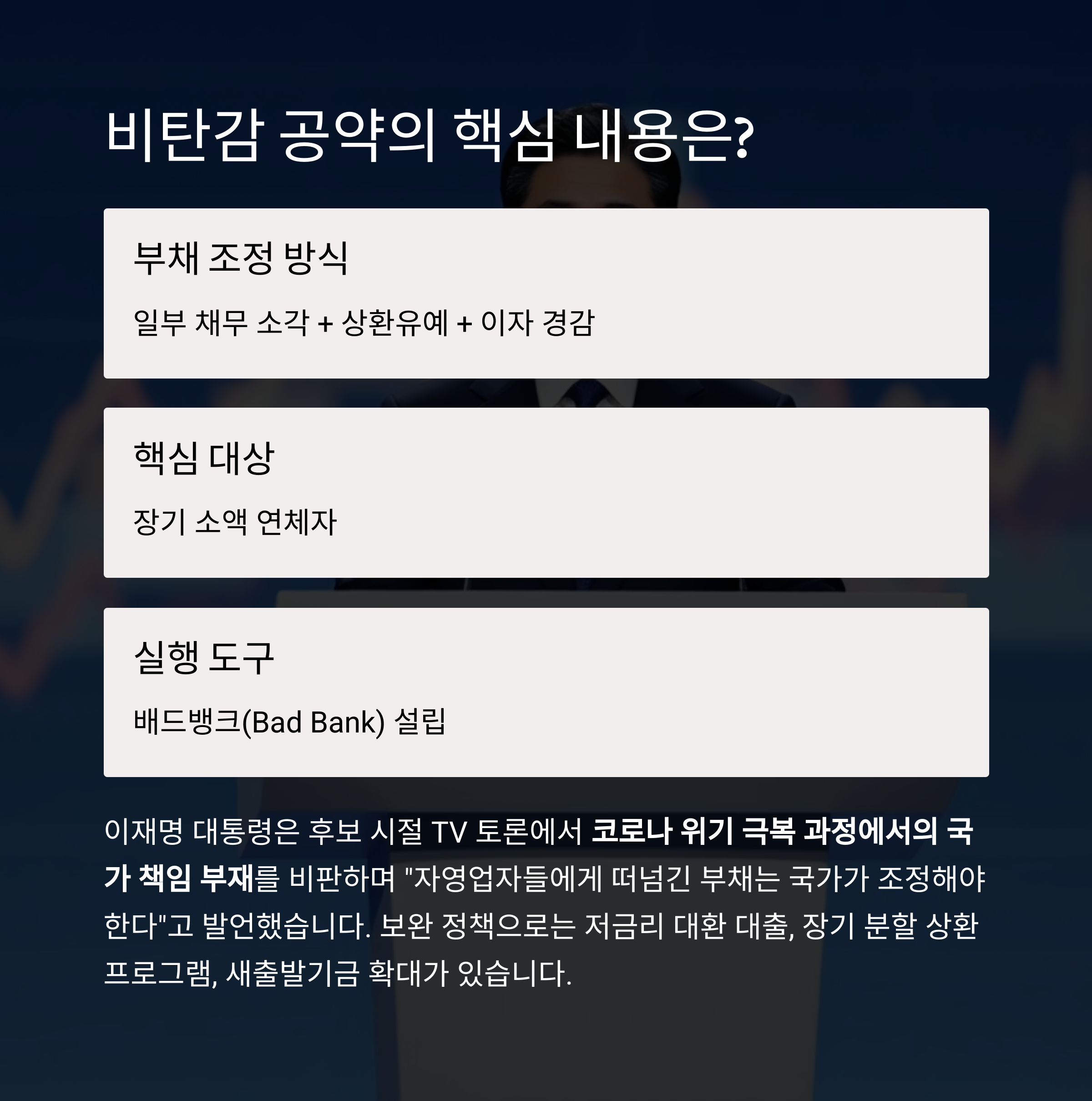 2025년 이재명 대통령이 1호 행정 명령으로 비상경제 TF 구성을 지시하며 소상공인 대상 **채무 감면 공약(비탄감)**이 본격적으로 주목받고 있습니다