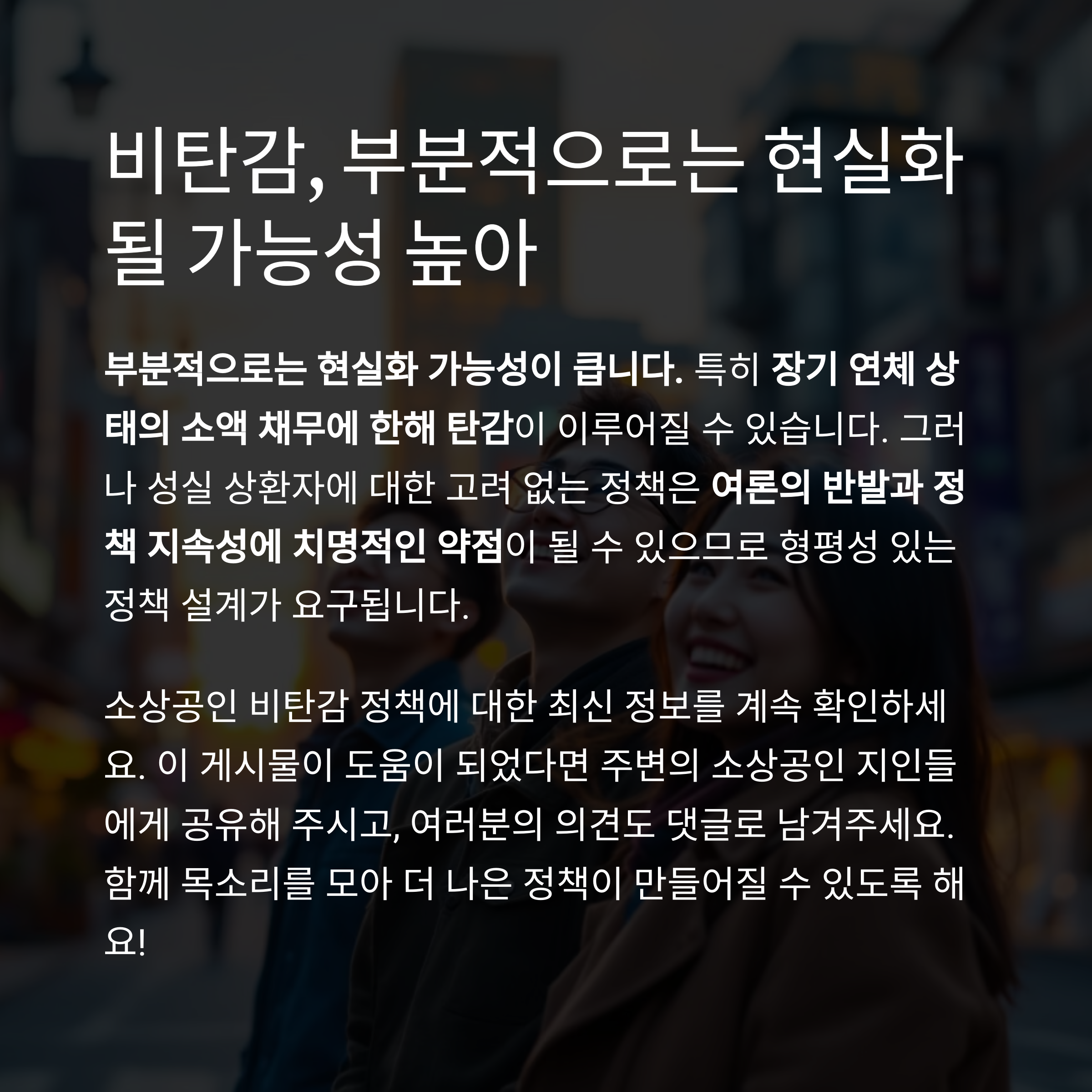 비탄감 공약은 전체 소상공인의 부채를 일괄 소각하는 것이 아니며, 장기 연체 상태에 있는 소액 채무자에게만 적용될 가능성이 큽니다