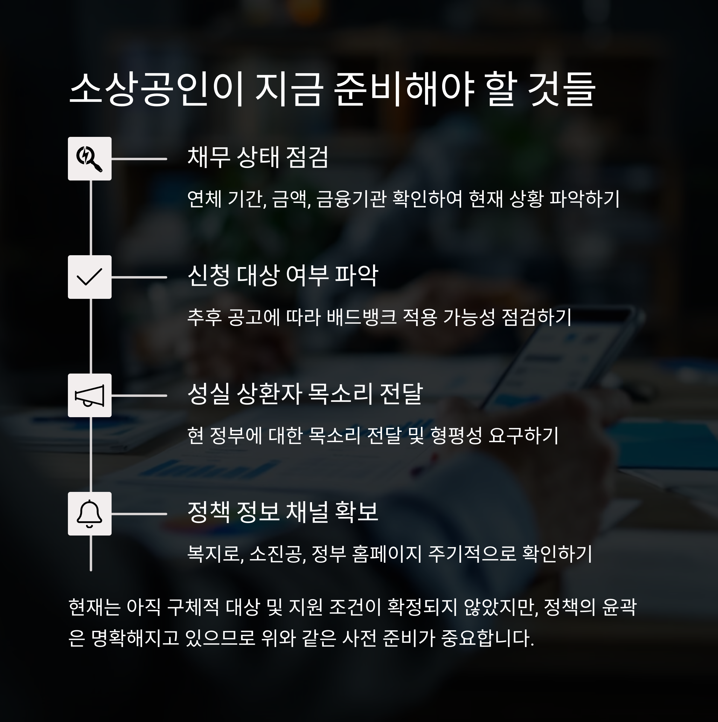 | 신청 대상 여부 파악 | 추후 공고에 따라 배드뱅크 적용 가능성 점검 |