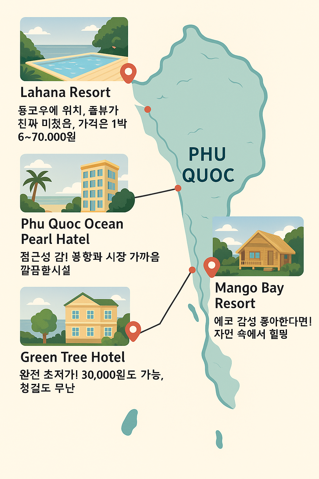 처음엔 저예산으로 푸꾸옥을 즐길 수 있을까 걱정했지만, 오히려 가성비 리조트들 덕분에 여행의 질은 더 높았던 것 같아요. 작은 정보 하나하나가 큰 차이를 만든다는 걸 새삼 느꼈던 시간이었습니다. 다음 글에서는 ‘푸꾸옥 맛집 리스트’로 찾아뵐게요! 🍽️