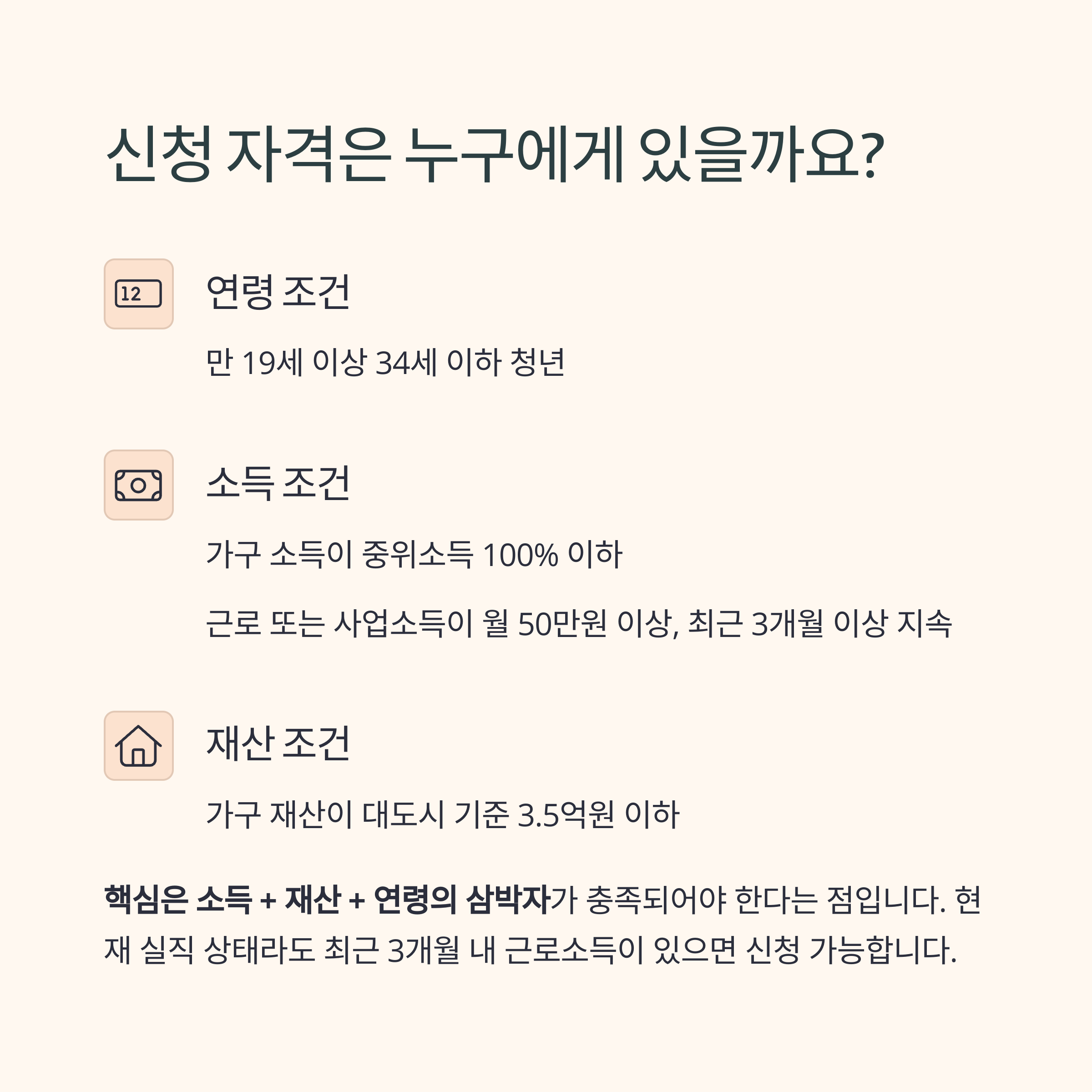 또한 신청자는 근로 또는 사업소득이 월 50만 원 이상,최근 3개월 이상 지속되고 있어야 하며, 가구 재산이 대도시 기준 3.5억 원 이하인 조건도 포함됩니다.