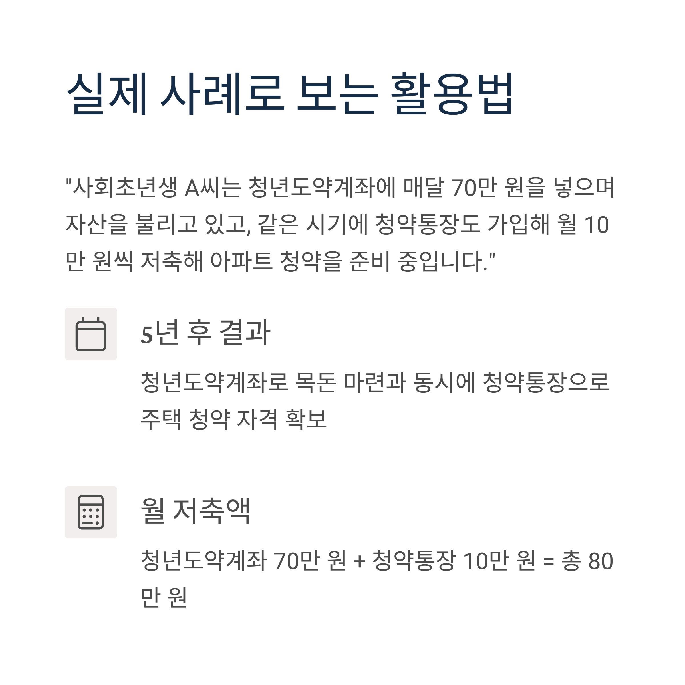 이처럼 두 상품을 병행하면 5년 후 자산도 마련하고, 주택 청약 자격도 확보할 수 있습니다.
