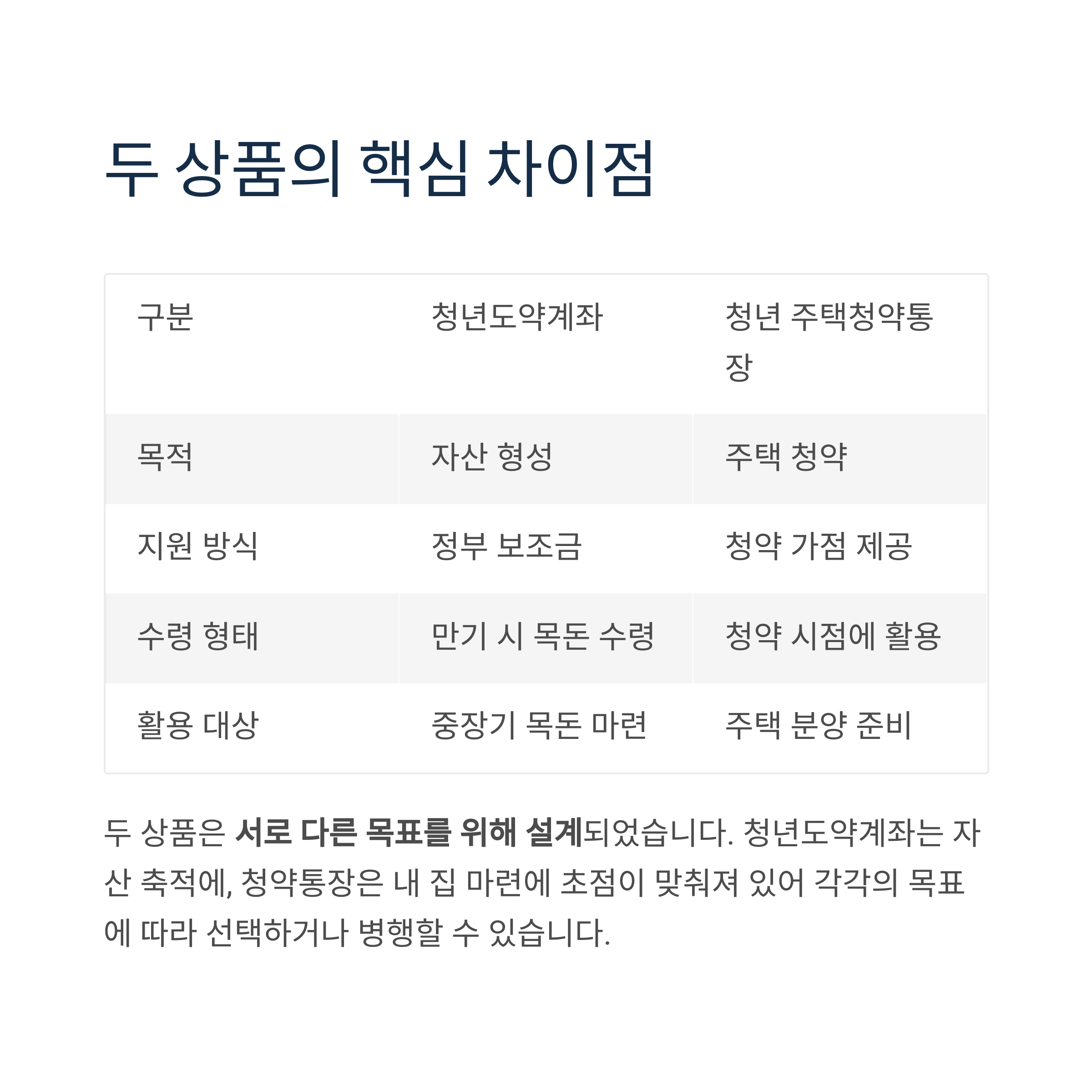 이 두 가지 금융 상품은 자산 축적과 내 집 마련이라는 서로 다른 목표를 위해 설계되었으며,