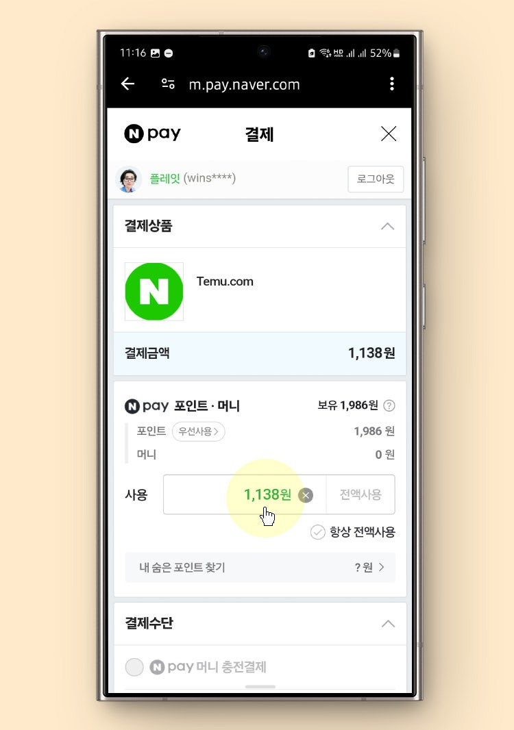 아쉽게도 현재 테무에서는 네이버페이 포인트 사용이 불가능합니다.