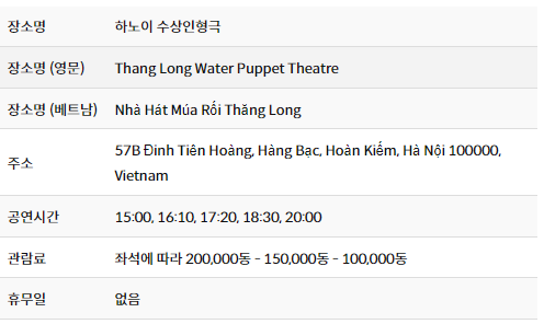 인형극극장을 방문하려면, 특히 관광 성수기에는 사전에 티켓을 예매하는 것이 좋습니다. 극장은 하루에 여러 번의 공연을 제공하여 하노이 체류 동안 이 전통 예술 형태를 목도할 충분한 기회를 제공합니다.