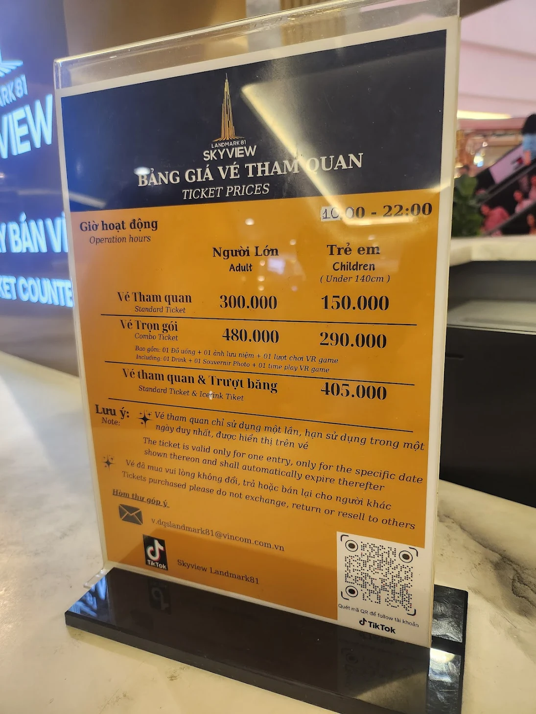Landmark 81은 벤탄시장과 차량으로 15분거리에 위치하고 있으며, Landmark 81은 빈컴센터 내 있으며, klook에서 사전구입도 가능합니다. 현장구입은 빈컴센터 지하 1층 매표소에서 스탠다드티켓 300,000동으로 결제가능합니다. 전망대관람은 79층에 내려 81층까지 오르면서 호치민 시내 야경을 한눈에 볼 수 있습니다.