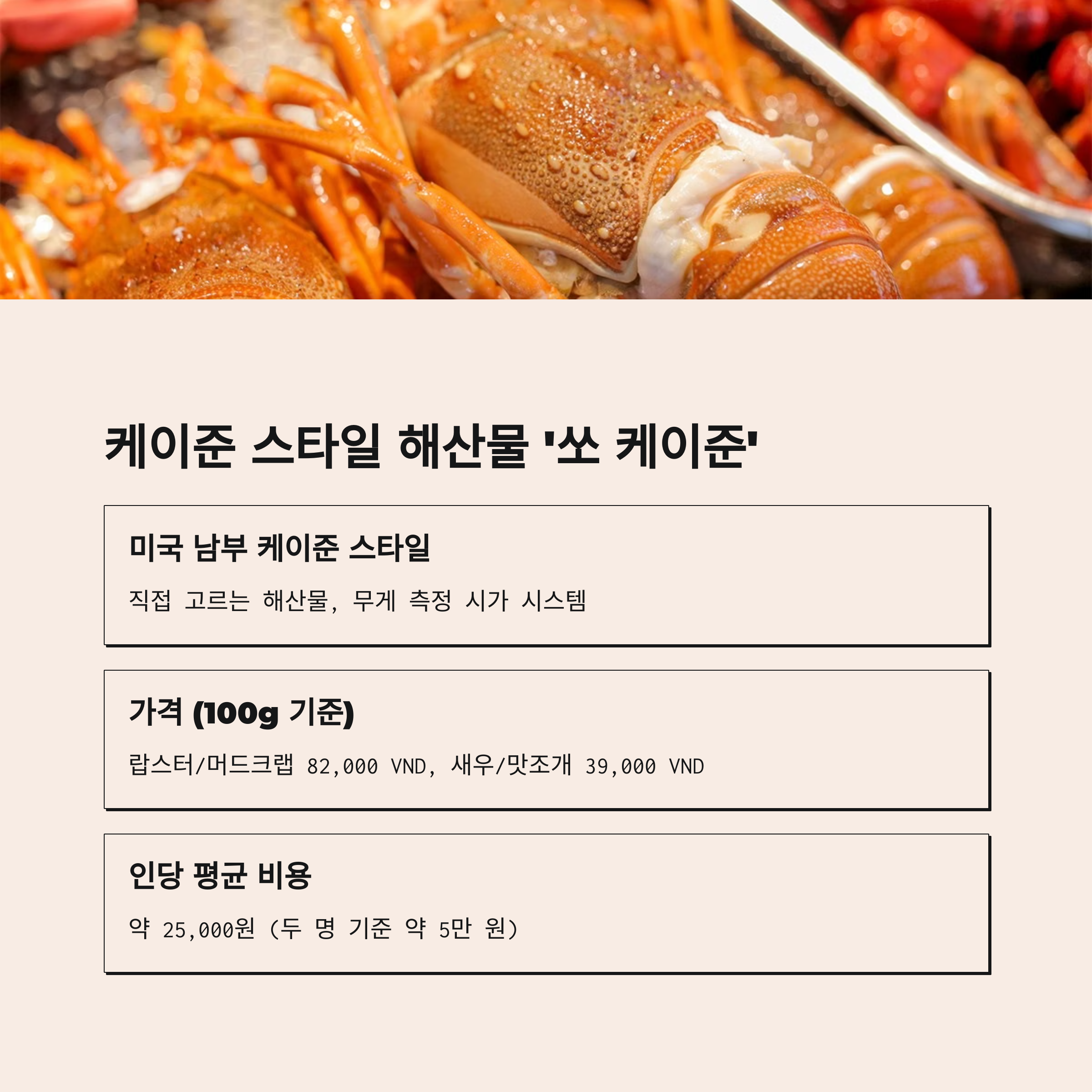 | 쏘 케이준 | 약 25,000원 | 케이준 소스+머드크랩 가능 |