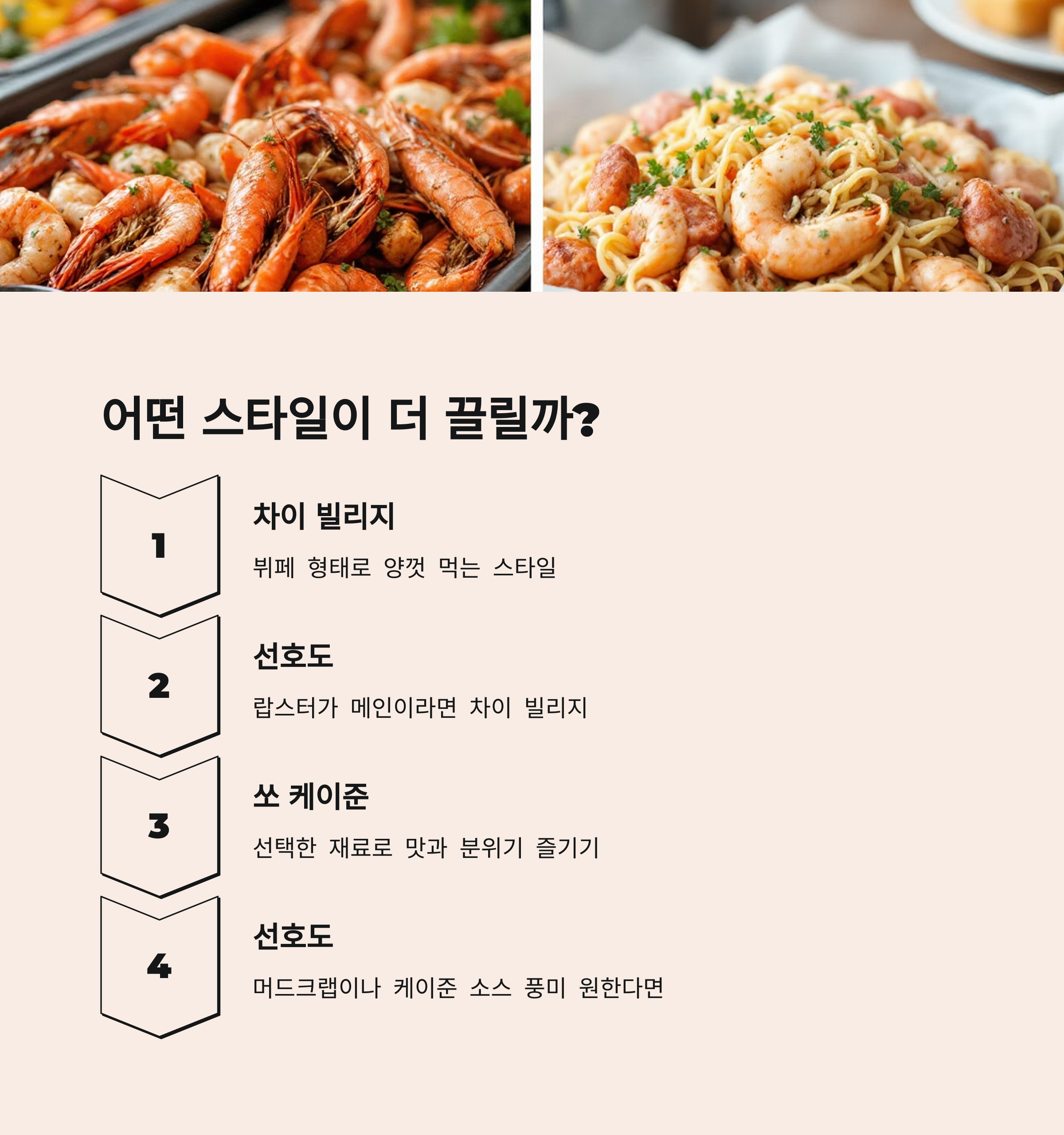 머드 크랩이나 케이준 소스의 진한 풍미를 원한다면 쏘 케이준이 더 어울립니다.