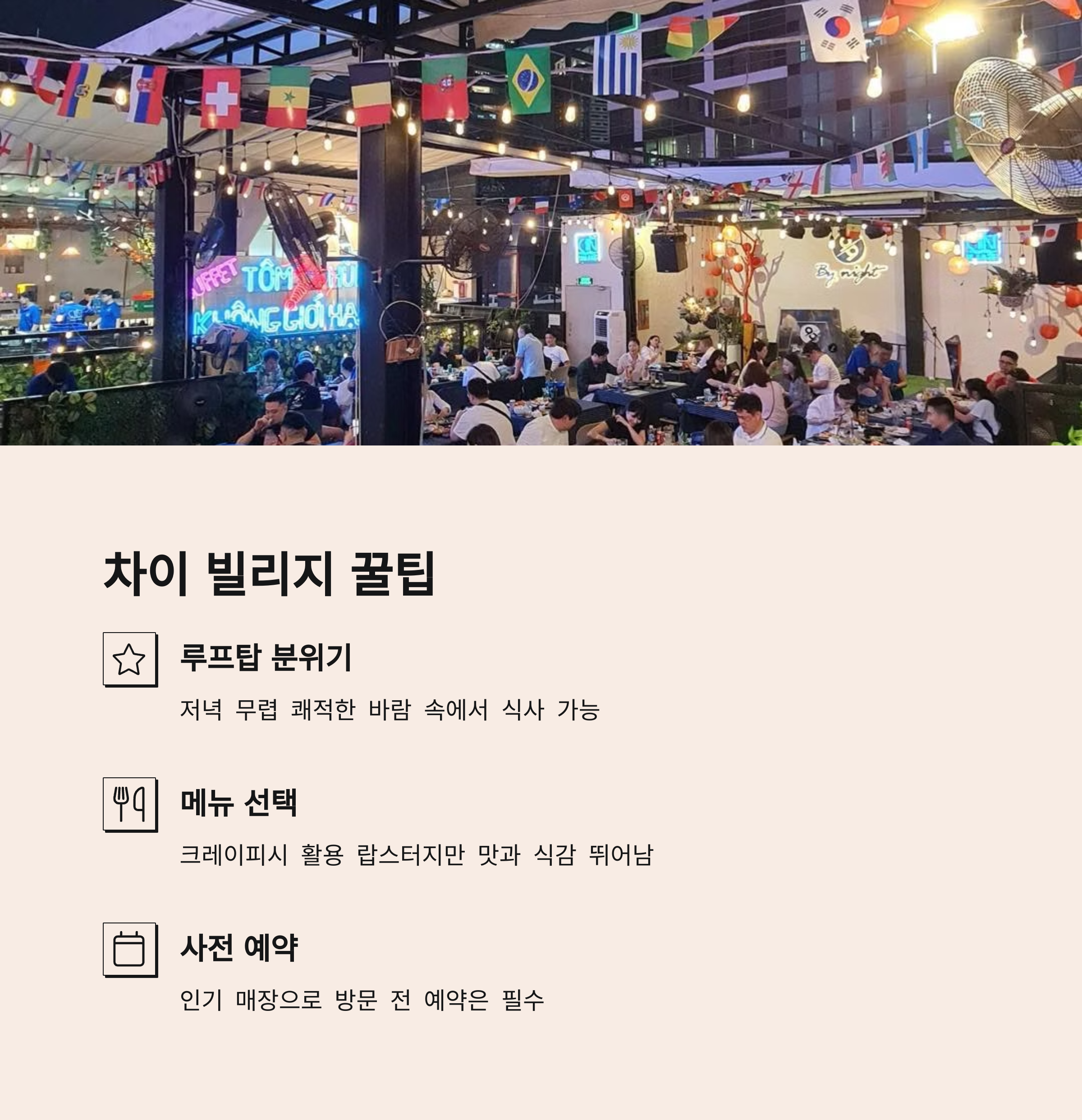 - 예약 필수: 차이 빌리지는 특히 인기가 많으니 사전 예약 필수입니다.