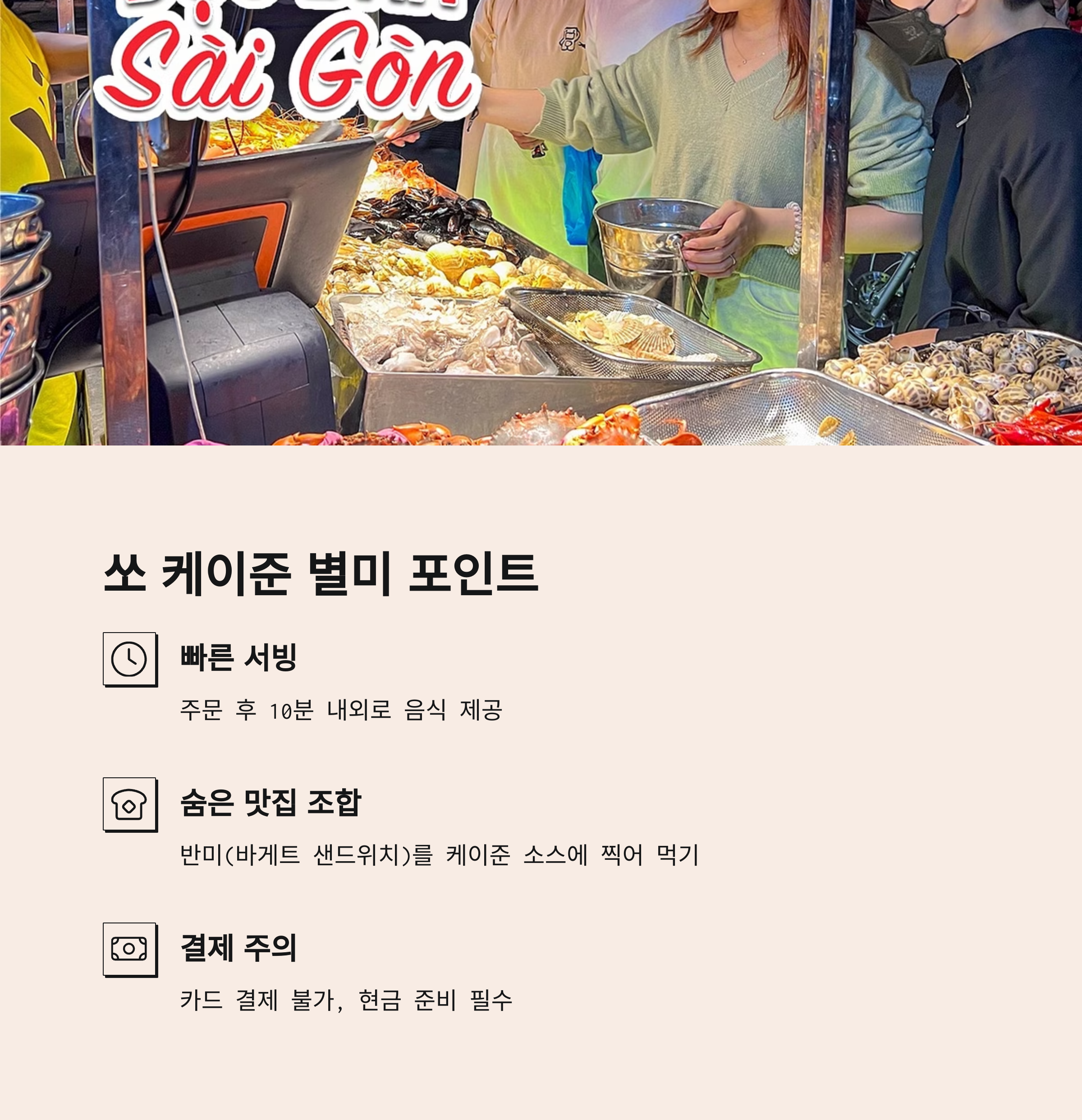 - 현금 준비: 쏘 케이준은 카드 결제가 불가능합니다.