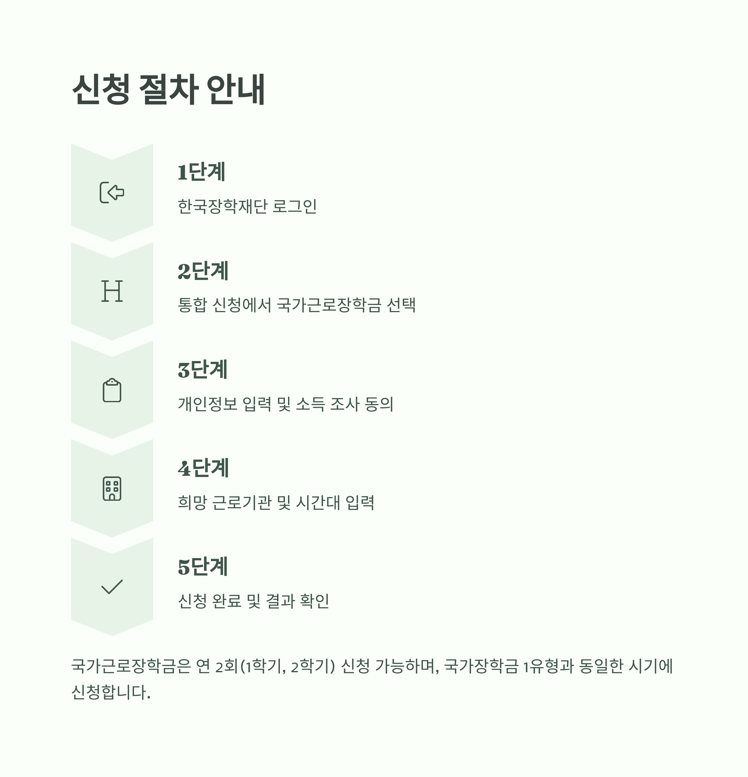 국가근로장학금 신청은 연 2회(1학기, 2학기) 한국장학재단 누리집에서 진행됩니다.