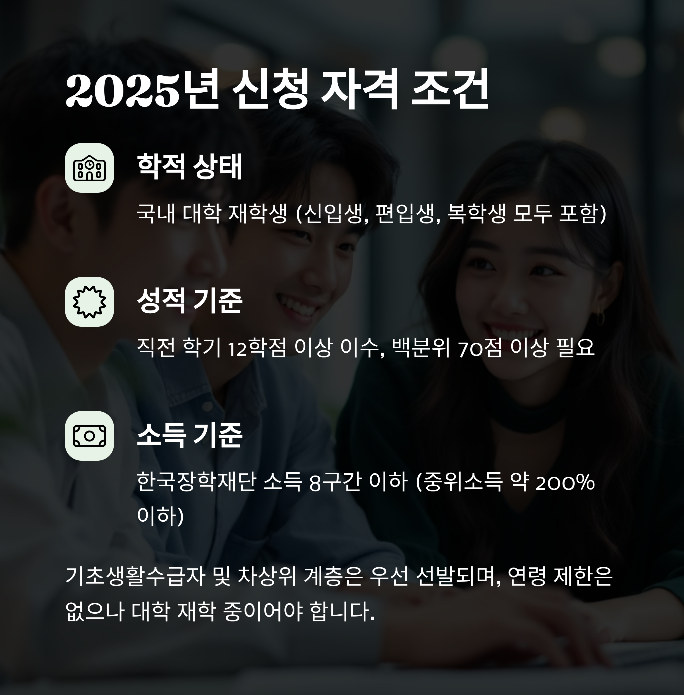 | 소득 기준 | 한국장학재단 소득 8구간 이하 (중위소득 약 200% 이하) |