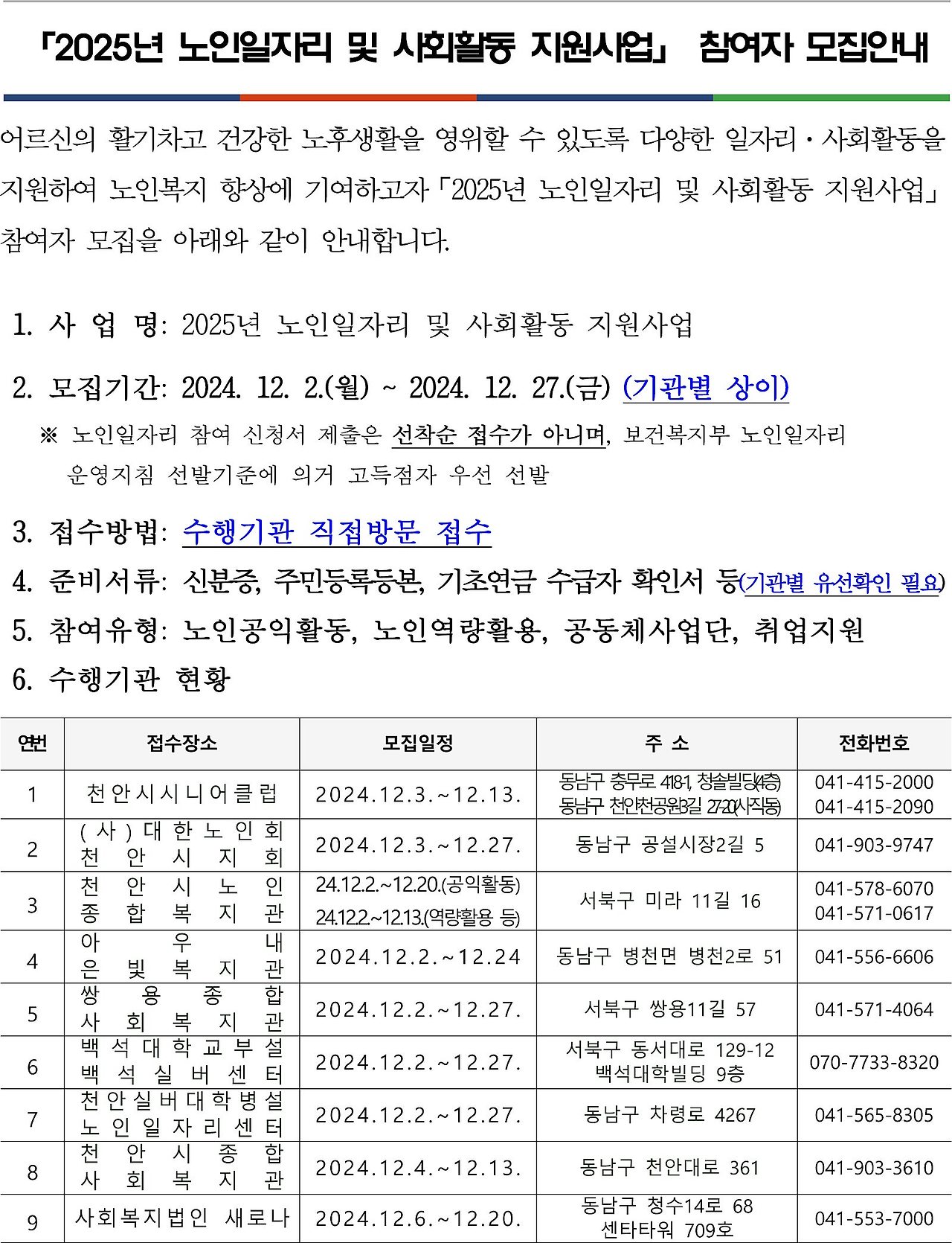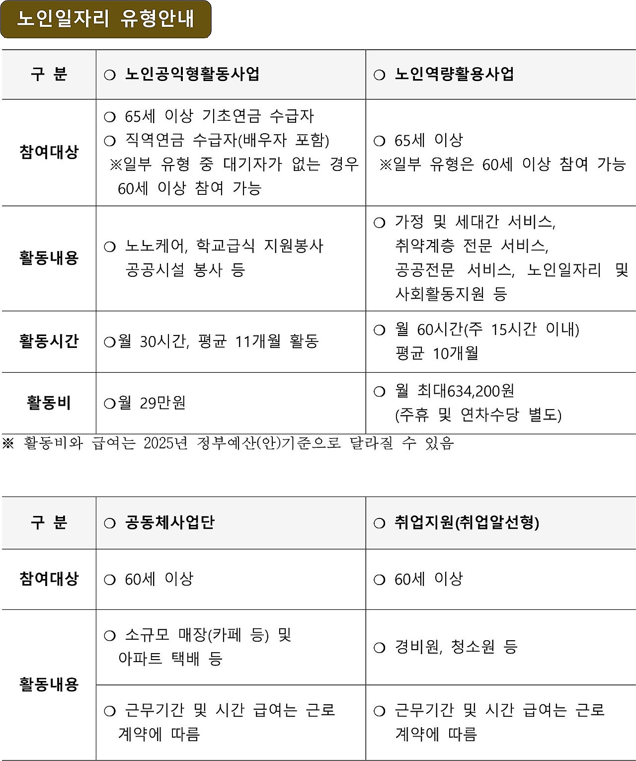 「2025년 노인일자리 및 사회활동 지원사업」 참여자를 아래와 같이 모집하오니 많은 참여 부탁드립니다.