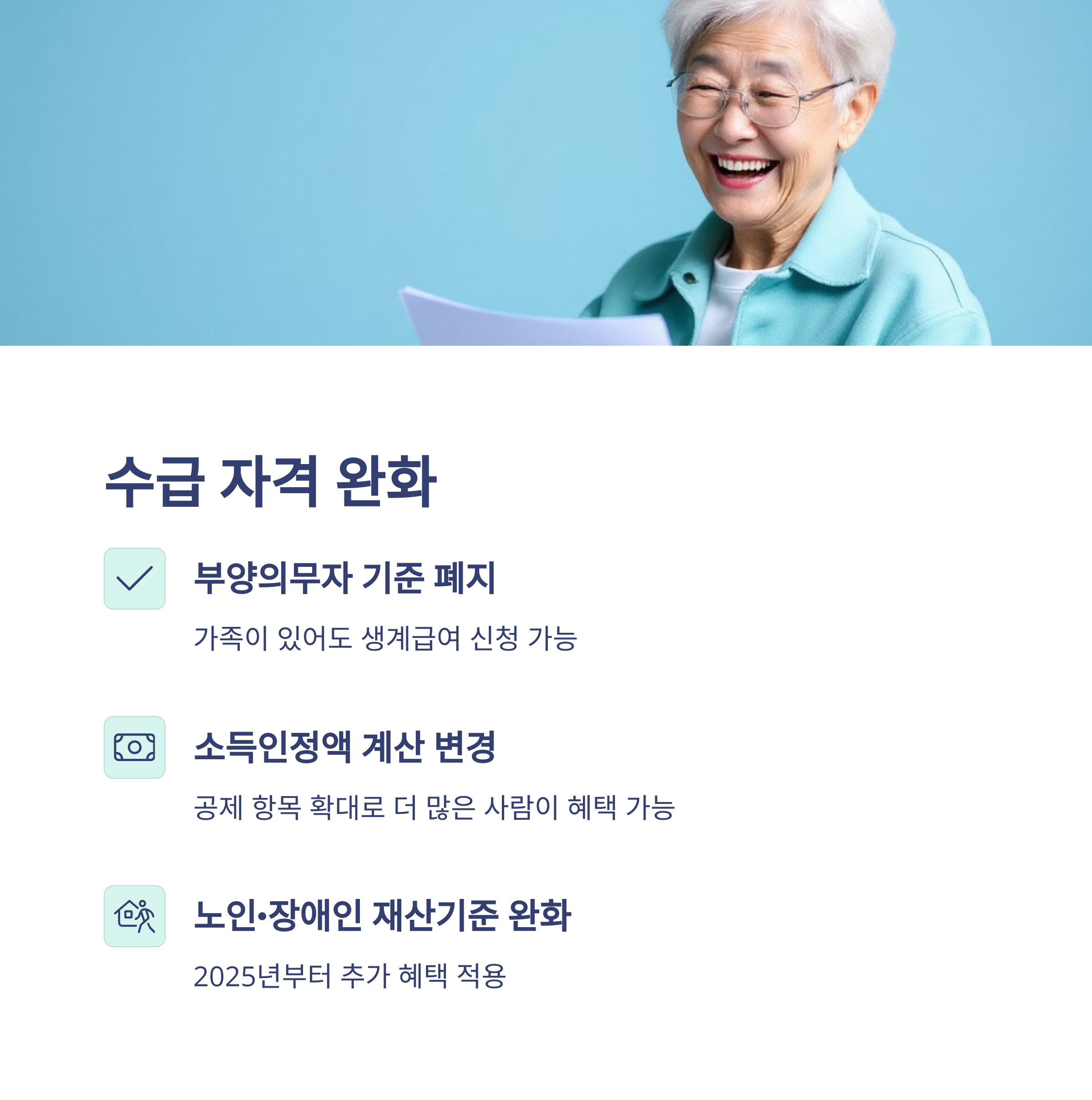 "2025년부터 노인·장애인 가구의 재산 기준 완화도 함께 적용" 또한 부양의무자 기준은 이미 폐지되어