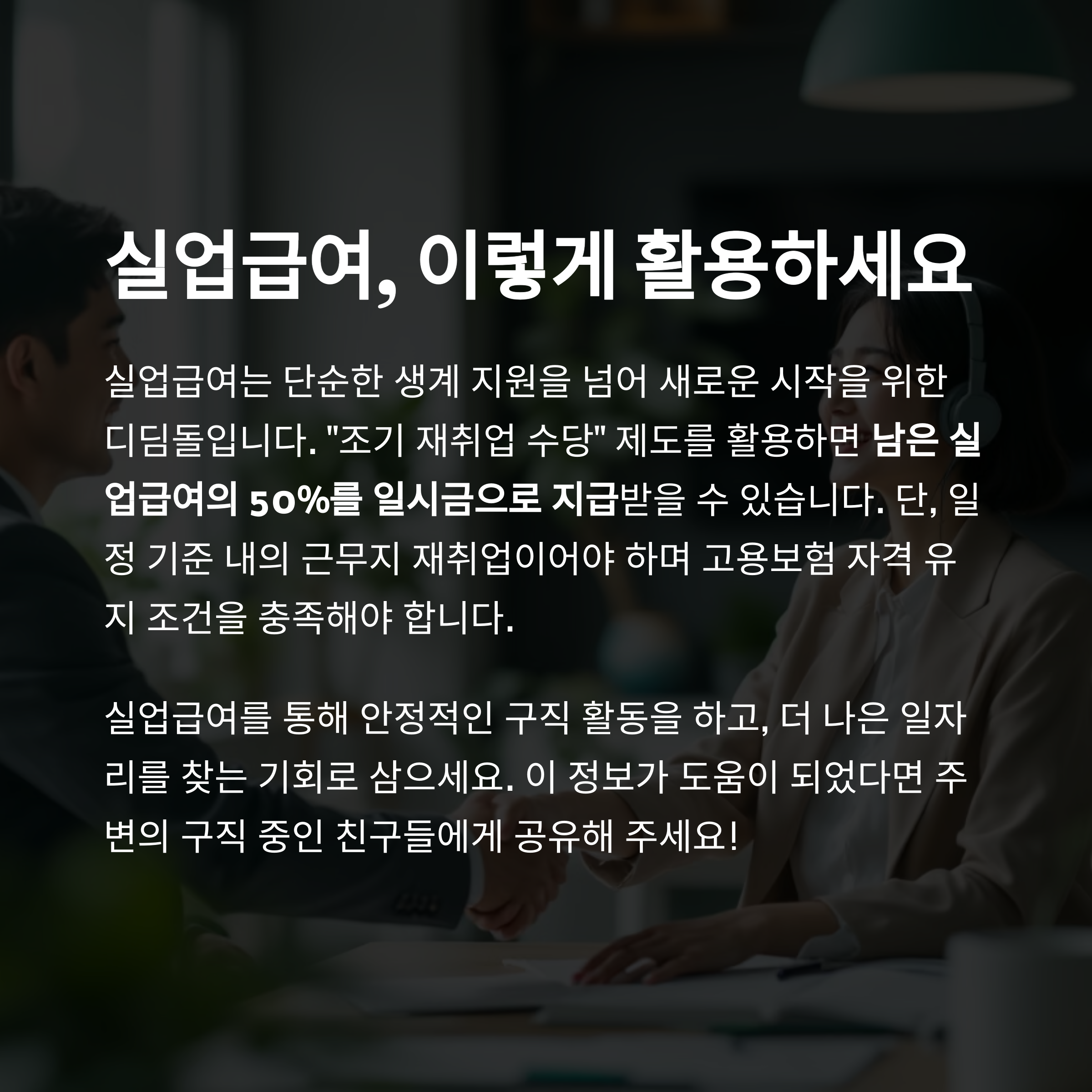 남은 실업급여의 50%를 일시금으로 지급받을 수 있습니다.