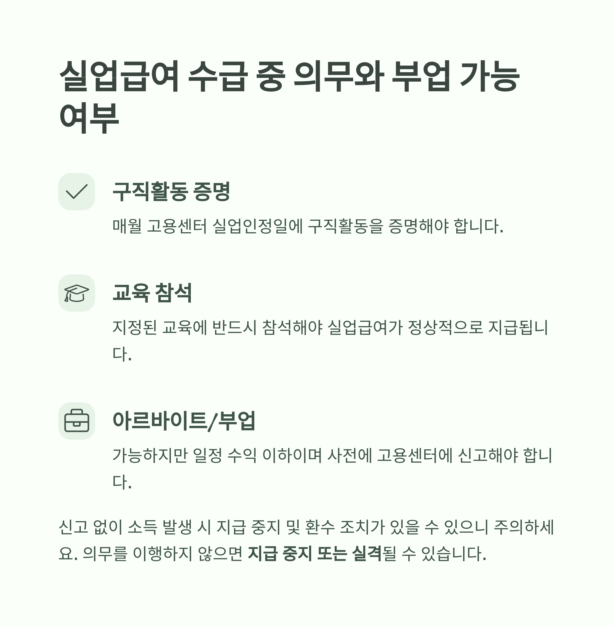 "매월 고용센터 실업인정일에 구직활동을 증명해야 하며, 지정된 교육에 반드시 참석해야 실업급여가 정상적으로 지급됩니다."