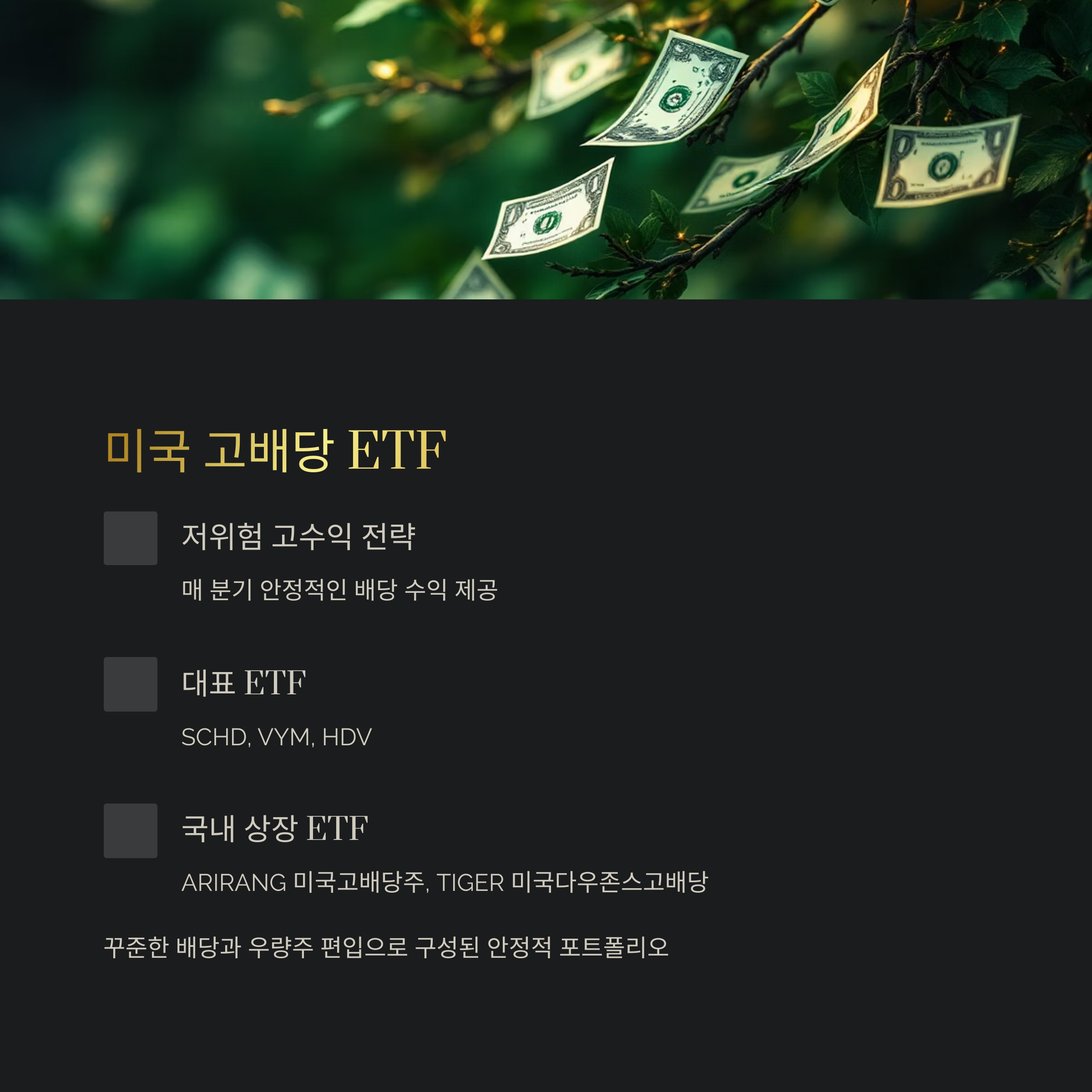 미국 고배당주 중심의 ETF는 매 분기 안정적인 배당 수익을 제공하며,