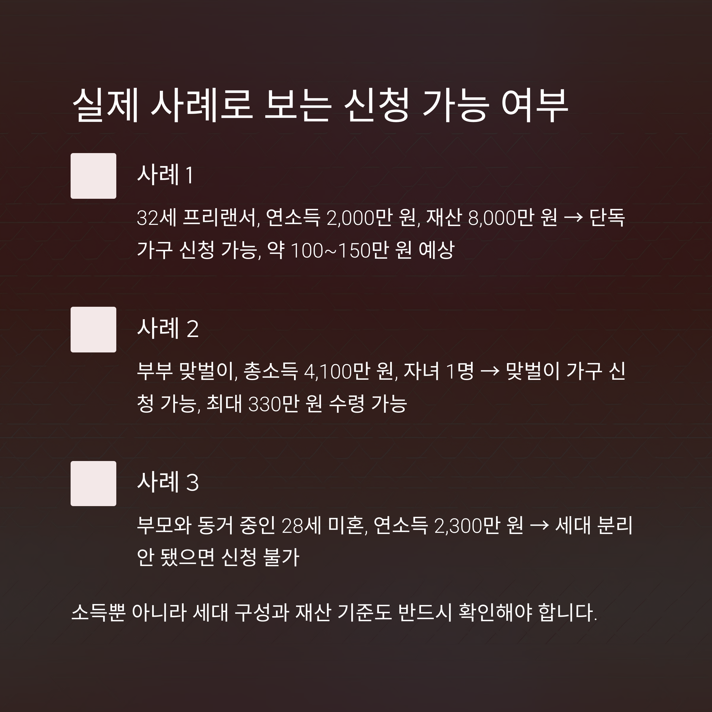 "단순히 소득만 보고 판단하면 안 됩니다. ‘세대구성’과 ‘재산기준’까지 고려해야 진짜 자격이 나옵니다."
