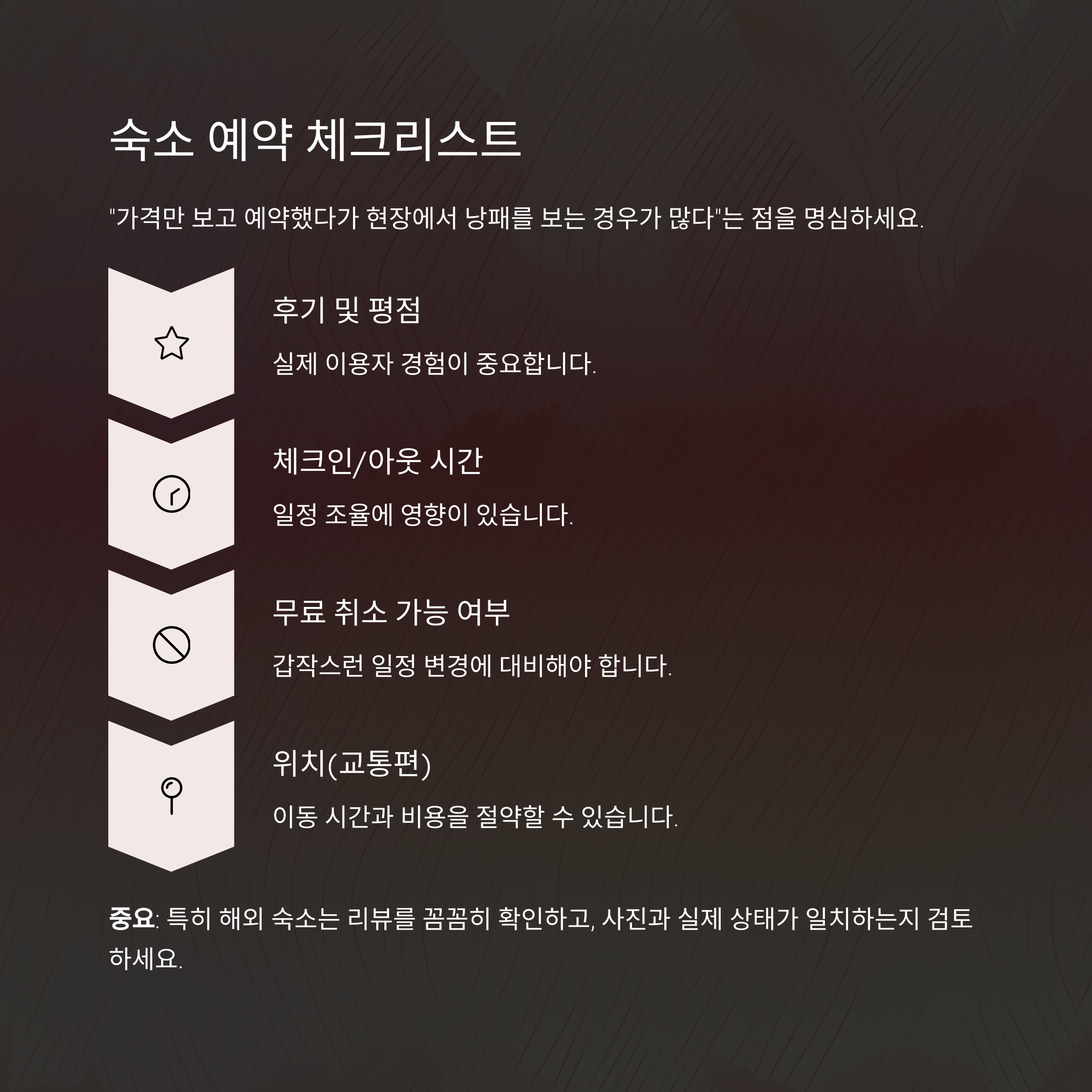 "가격만 보고 예약했다가 현장에서 낭패를 보는 경우가 많다"는 점에서,숙소 선택 시에는 다음과 같은 항목을 반드시 확인해야 합니다.