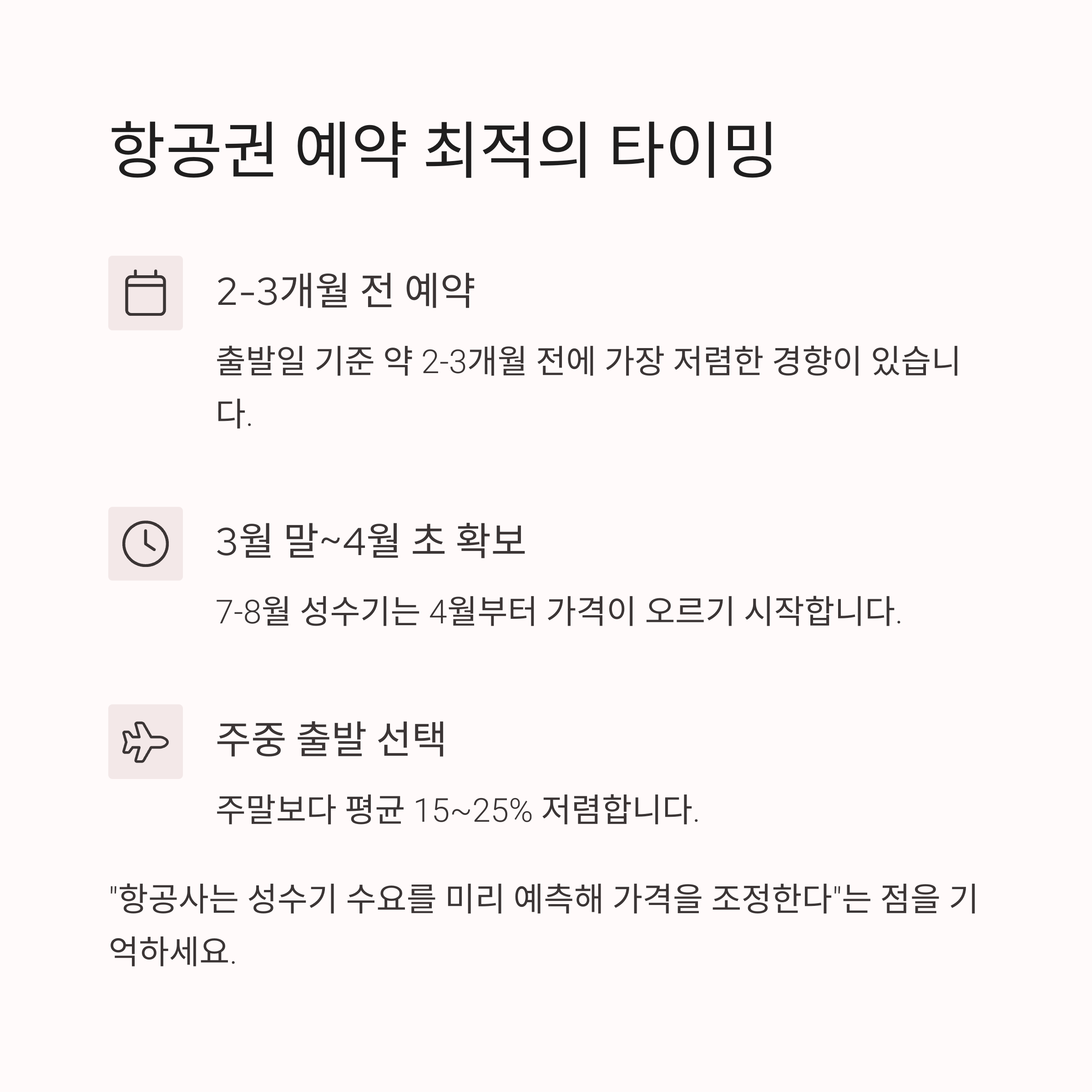 "항공사는 성수기 수요를 미리 예측해 가격을 조정한다"는 점을 고려해야 하며, 주중 출발 항공편이 주말보다 평균 15~25% 저렴한 것도 꿀팁입니다.