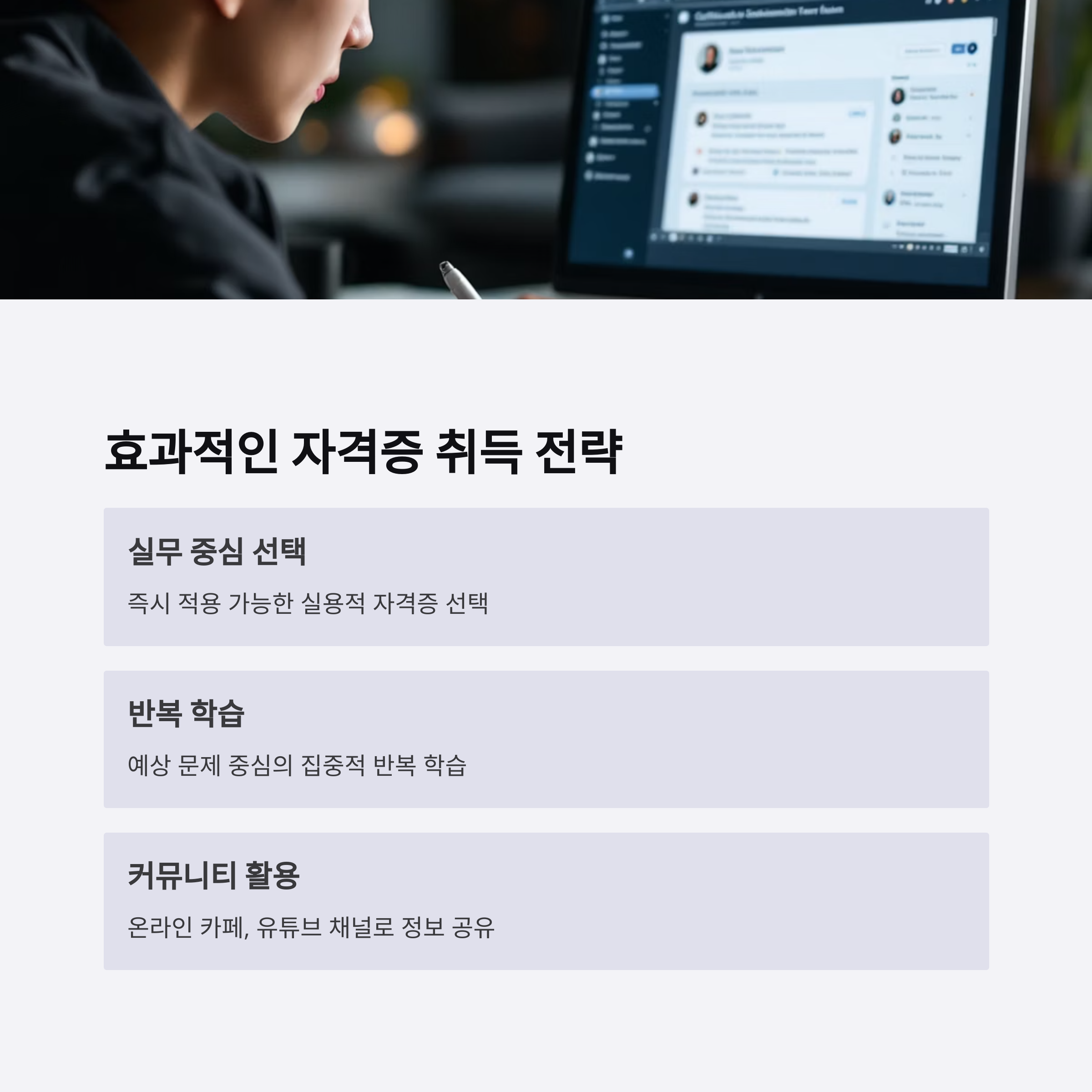 자격증은 실무에 즉시 적용 가능한 것을 선택해야 합니다. 이론보다 실기 중심으로, 예상 문제 반복 학습이 중요합니다.